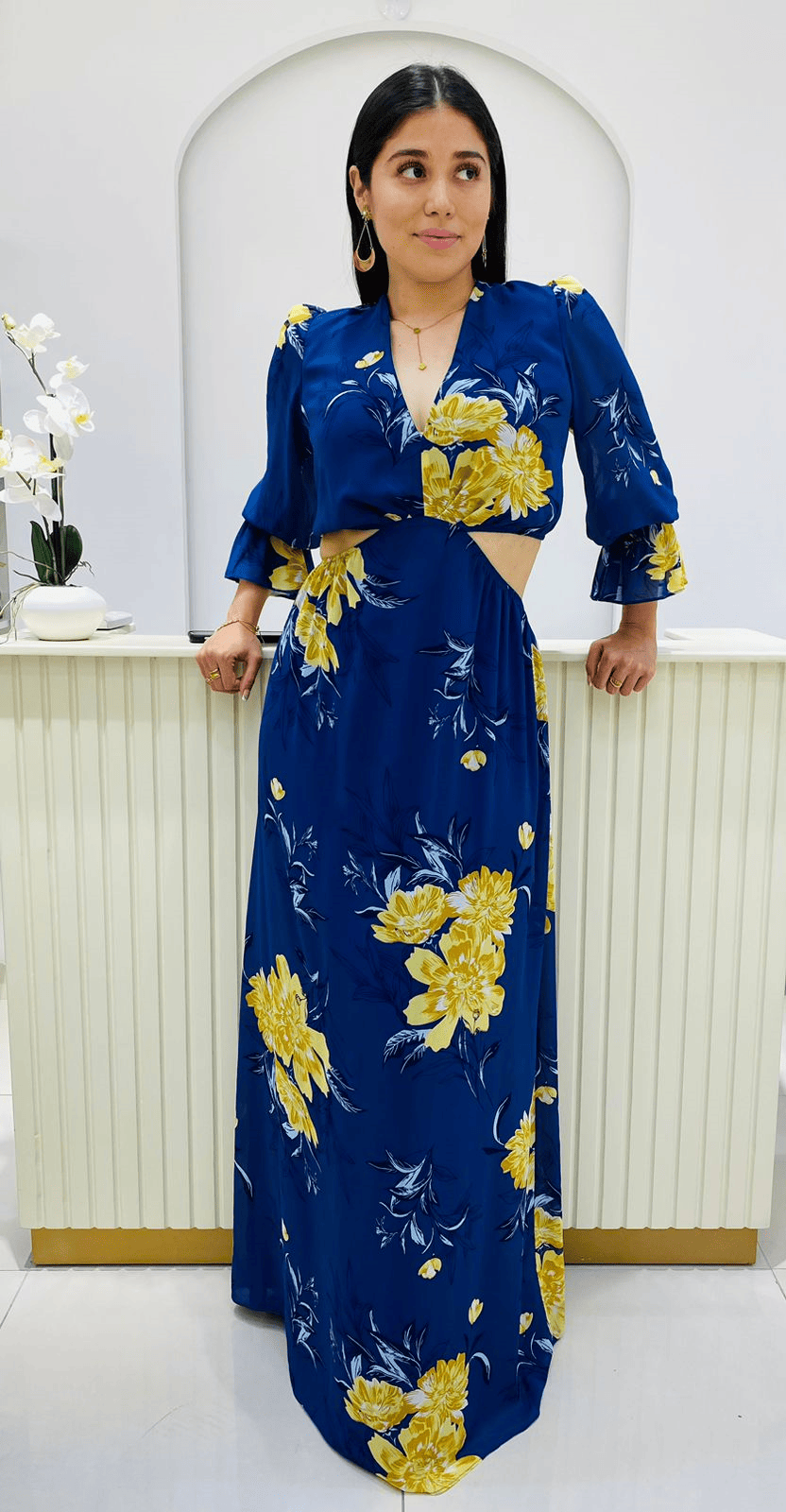 Vestido de color azul con flores amarillas