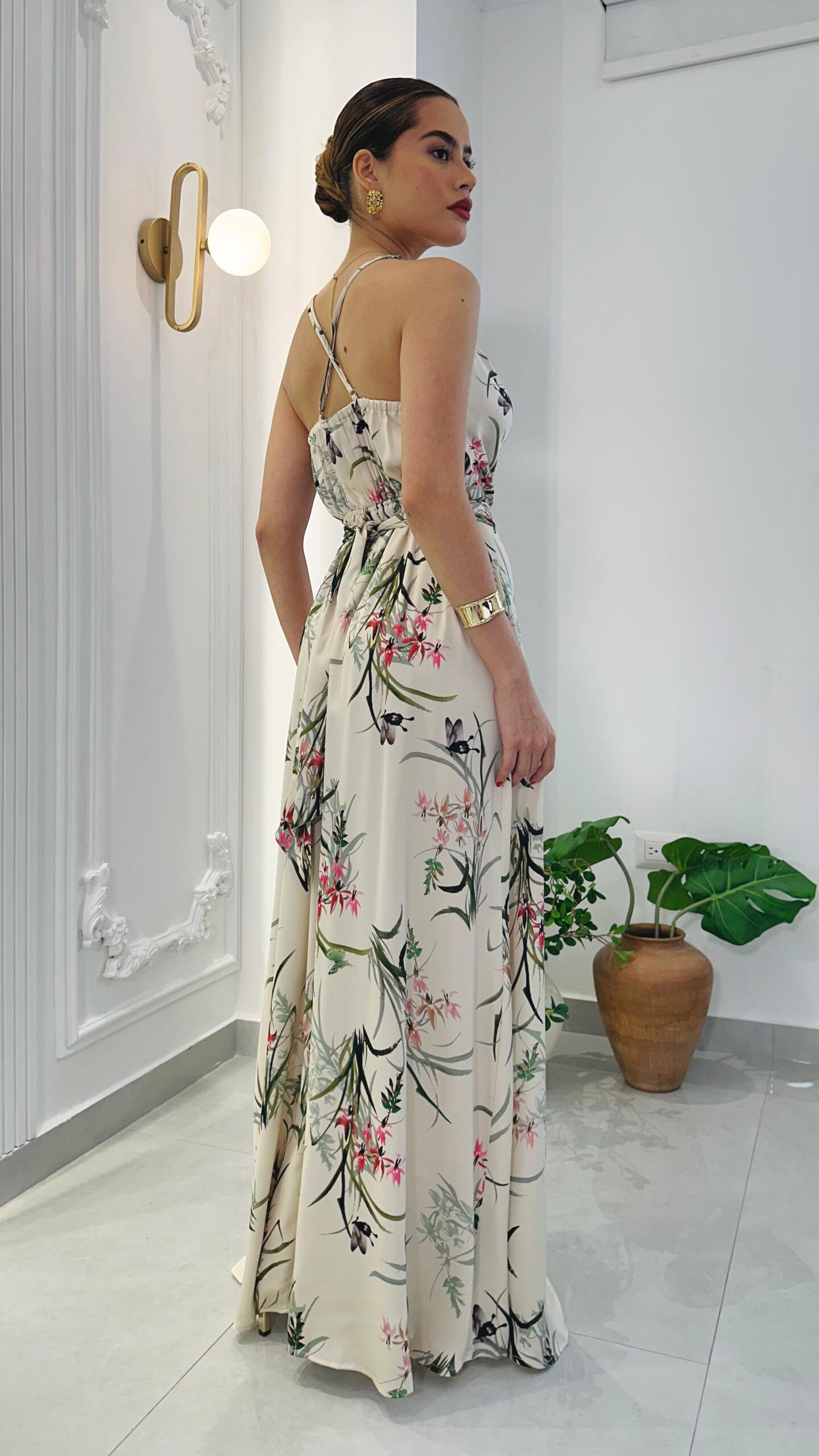 Vestido largo marfil con tirantes y estampado floral tropical, corte fluido y ajuste en la cintura. Elegante y fresco, ideal para ocasiones especiales.
